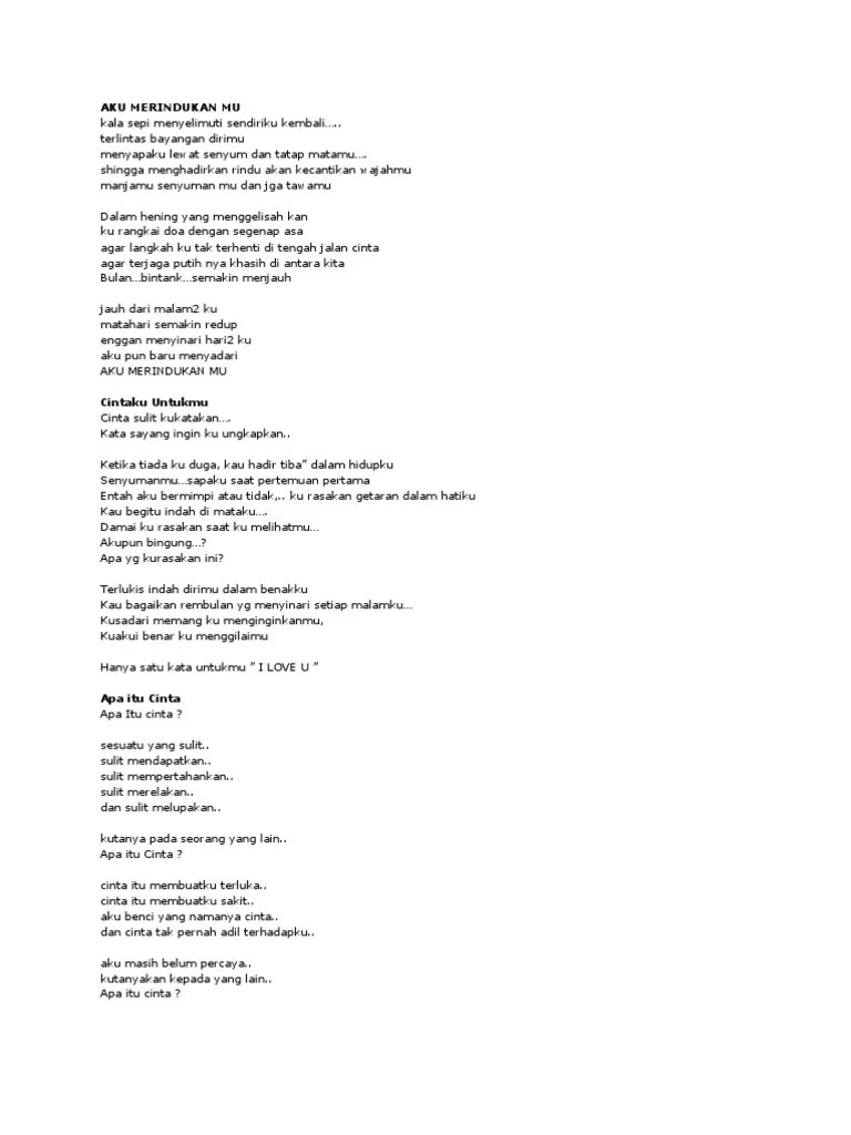 Yang terjadi pada diriku sayang. Lirik cinta yang hilang {puisi+lagu}. Tak percaya kau ada di pandangan. Kutuang semua diatas kertas putih yang bersih. Walau hanya ku tulis di atas puisi cinta Sedangkan untuk music video dan . | smule social singing karaoke app. Songtekst van fitri handayani met puisi cinta kan je hier vinden op songteksten.nl. Lagu puisi cinta kini bisa kamu dengarkan diberbagai platform musik seperti spotify, itunes, youtube music dan lain sebagainya. Lirik lagu inka cristie : Slowrock inka cristie memang keren abis… termasuk yang satu ini, puisi cinta. Lagu puisi cinta ~ilusi~ ~*(by_irizz edit)*~ Pastikan anda sudah melihat video musiknya.